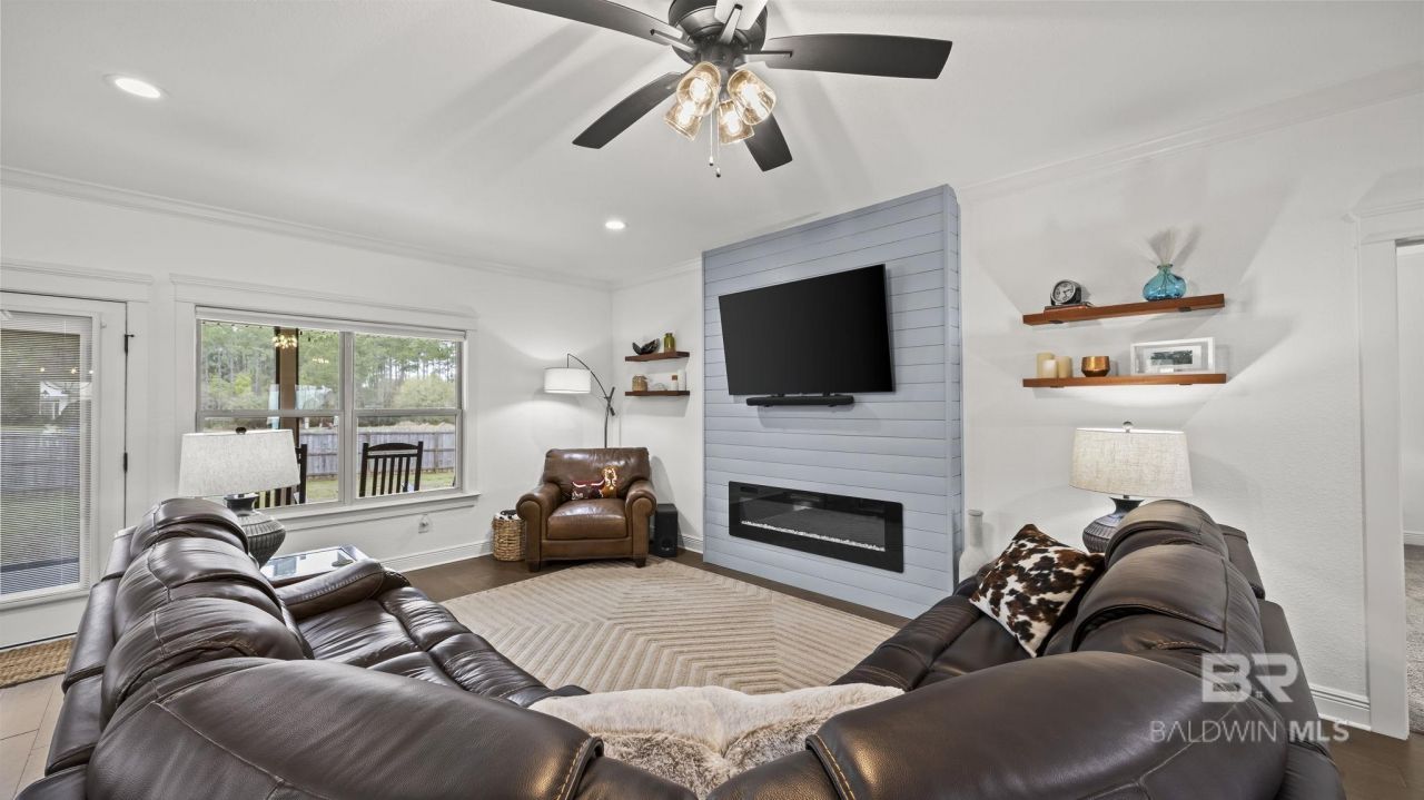 Tucked away in the laid-back charm of Robertsdale, this like-new 3-bedroom, 2.5-bath Craftsman-style home offers the perfect mix of peaceful living and everyday convenience?just minutes from shopping and dining and about 30 minutes from the sugar-white Gulf beaches. With a fenced backyard, screened porch, and side-entry two-car garage, this move-in ready home is designed for easy, comfortable living. Inside, the open-concept layout feels bright and inviting with manufactured hardwood flooring throughout the main living areas, crown molding, recessed lighting, and ceiling fans. The living room features a shiplap-accented electric fireplace that creates a warm focal point and natural gathering space. The spacious kitchen offers stone countertops, stainless appliances, abundant cabinetry and prep space, bar seating, and a sunny breakfast area, along with a separate dining space that keeps the home's easy flow for everyday meals or gatherings. A split-bedroom floor plan provides privacy, leading to the generous primary suite with a soaking tub with tile backsplash, walk-in shower, dual vanities, and two separate closets. Two additional bedrooms and a full bath sit on the opposite side of the home plus an additional half bath on the way to the full sized laundry room with added storage cabinets. Out back, enjoy the screened porch and extended patio overlooking the fenced backyard?perfect for morning coffee or relaxed evenings outdoors. Fresh landscape beds with stone accents add curb appeal, while the side-entry two-car garage and wide driveway provide added convenience. you've been searching for a move-in ready home that offers space, comfort, and a quieter pace of life while still keeping the Gulf Coast beaches within easy reach, this one deserves a closer look. Buyer to verify all information during due diligence.