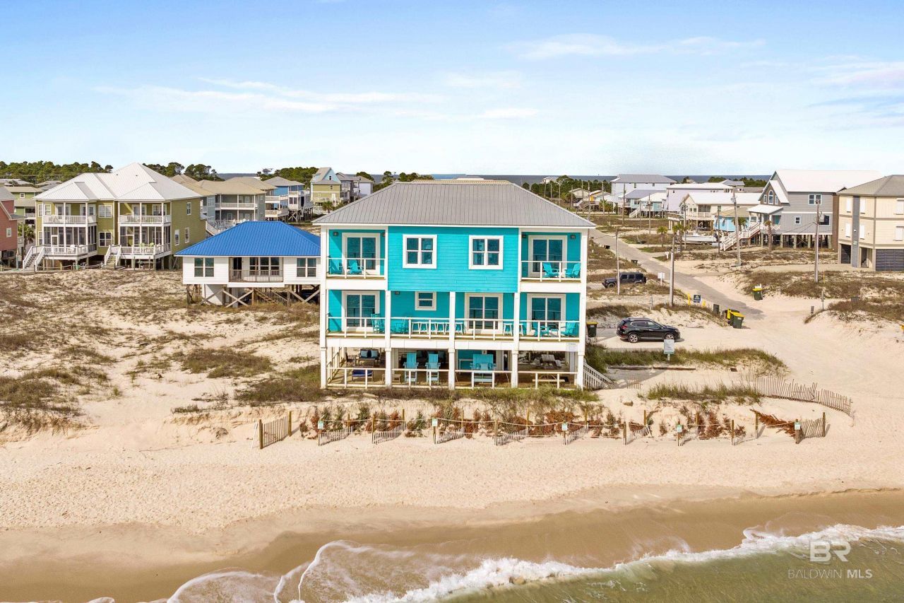 Located directly on the sandy shoreline, you're just steps away from the gorgeous waters of the Gulf where you can swim, fish, paddle board, or play in the sand. Enjoy this home for personal use or as an investment property with annual rental projections between $167k ? 205k! This bright beach house with 5 bedrooms and 4 bathrooms welcomes you with a layout that frames the stunning coastal scenery and panoramic Gulf views to the east and west. Multiple balconies and a spacious ground level deck invite you to soak in sunrises over the water or savor ocean breezes at sunset. Fort Morgan is a quiet beach community away from the hustle and bustle. Nearby you can find great dining options, golf, and places to explore, including a piece of history at the Fort Morgan Historic Site. Since 2021, the current owners have elevated this home by repainting the exterior, installing LVP flooring throughout, updating fixtures, and fully remodeling both the kitchen and bathrooms. Step inside to discover carefully chosen accents and furnishings that perfectly capture the breezy spirit of coastal living. The bright and airy living space features shiplap walls and direct balcony access. The kitchen features stainless steel appliances, granite countertops, new cabinets, a vibrant tile backsplash, and a breakfast bar for extra seating. The main-floor primary suite awaits, complete with crown molding, a board and batten accent wall, walk-in closet, en-suite bathroom, and direct balcony access. Upstairs, four more beautifully updated bedrooms each feature their own balcony access, two with en-suite baths, ideal for hosting family and friends in style. The deck beneath the home offers plenty of space for relaxing, grilling or hosting friends and family. In 2019, the exterior HVAC system was upgraded, and the water heater was replaced in 2022. Buyer to verify all information during due diligence.