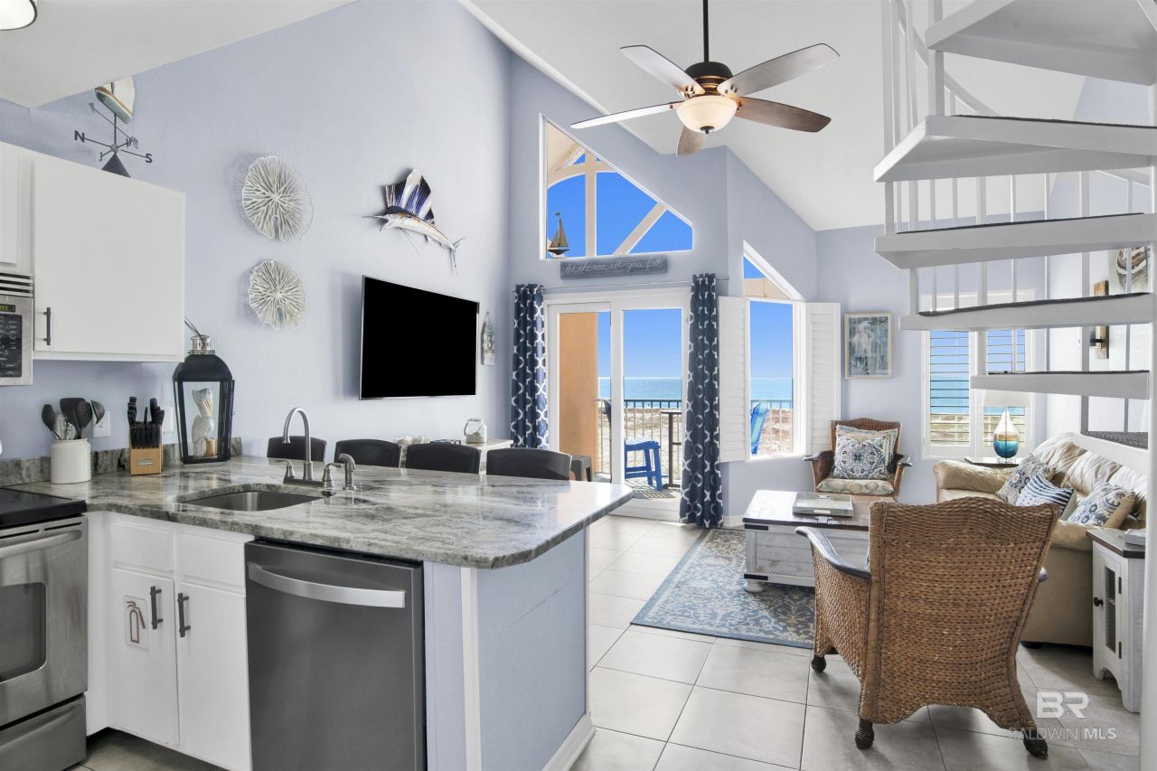 Grand Beach P3 - exceptional top-floor penthouse offering some of the most breathtaking, unobstructed views in the building. Positioned on the 5th floor, this rare unit sits above the road and power lines, allowing for a clear, uninterrupted view straight to the Gulf of Mexico and all the way down to the iconic Gulf State Park Pier.Two-story cathedral ceilings in the living room, creating a bright and airy feel, along with a spiral staircase leading to the loft.  Comfortably sleeping 8 with a king bed in the loft, queen bed on the main level, twin hallway bunk beds, and a sofa sleeper?ideal for rental or personal use. Recent updates include HVAC, ductwork, plumbing, windows, and sliding glass door, plantation shutters, updated flooring, granite countertops, stainless appliances, and lighting. Located within walking distance to restaurants, shopping, and entertainment, with easy beach access directly across the street. Buyer to verify all information during due diligence.