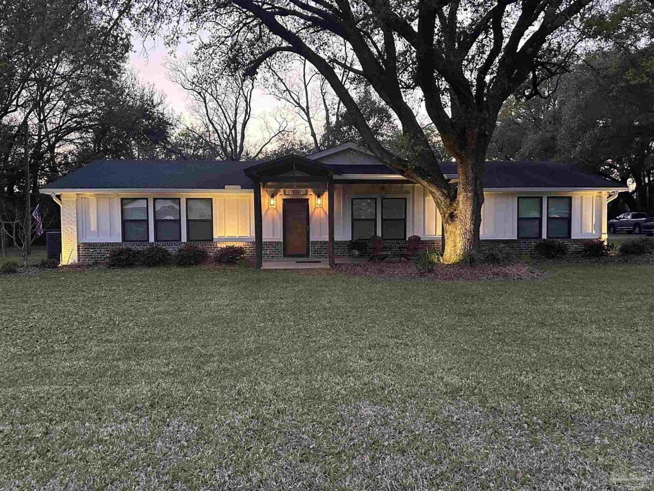 Beautifully updated home in Pace situated on nearly 2 acres, including a separate 1-acre wooded lot next door filled with stunning mature oak trees-offering privacy and a peaceful, natural setting. This home was completely stripped to the studs in 2020 and rebuilt with everything new, including electrical, plumbing, roof, windows, kitchen, and bathrooms. Designed with comfort and efficiency in mind, the home features spray foam insulation in both the walls and ceiling and tankless gas hot water. Inside, you'll find a bright open-concept layout with a formal dining area and a beautiful kitchen that flows seamlessly into the living space-perfect for entertaining or everyday living. The kitchen is ideal for the cook in the family, offering both style and functionality. The spacious primary suite includes a walk-in closet, double vanity, and a large walk-in shower for a true retreat feel. Additional highlights include washer and dryer conveying with the home, blinds throughout, partial fencing, and well water for irrigation. Enjoy outdoor living with a covered front porch and back patio, plus a covered walkway leading to extra storage. The property also features an 18x30 detached garage with potential to convert into a guest cottage, RV hookup, extra parking, and plenty of privacy. Conveniently located just minutes from Five Points, nearby shops, and a short walk or golf cart ride to the Piggly Wiggly, Dollar General and Wallace Lake School K-8. This home offers the perfect blend of peaceful living and everyday convenience.